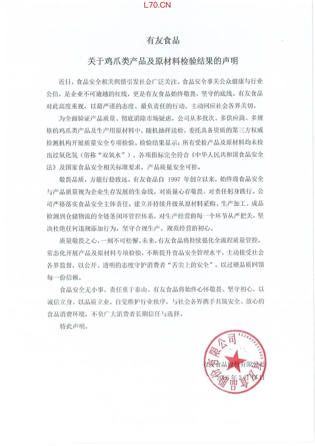 3月17日,有友食品发布关于鸡爪类产品及原材料检验结果的声明称,为全面验证产品质量、彻底消除市场疑虑,公司从多批次、多供应商、多规格的鸡爪类产品及生产用原材料中,随机抽样送检,委托具备资质的第三方权威检测机构开展质量安全专项检验。