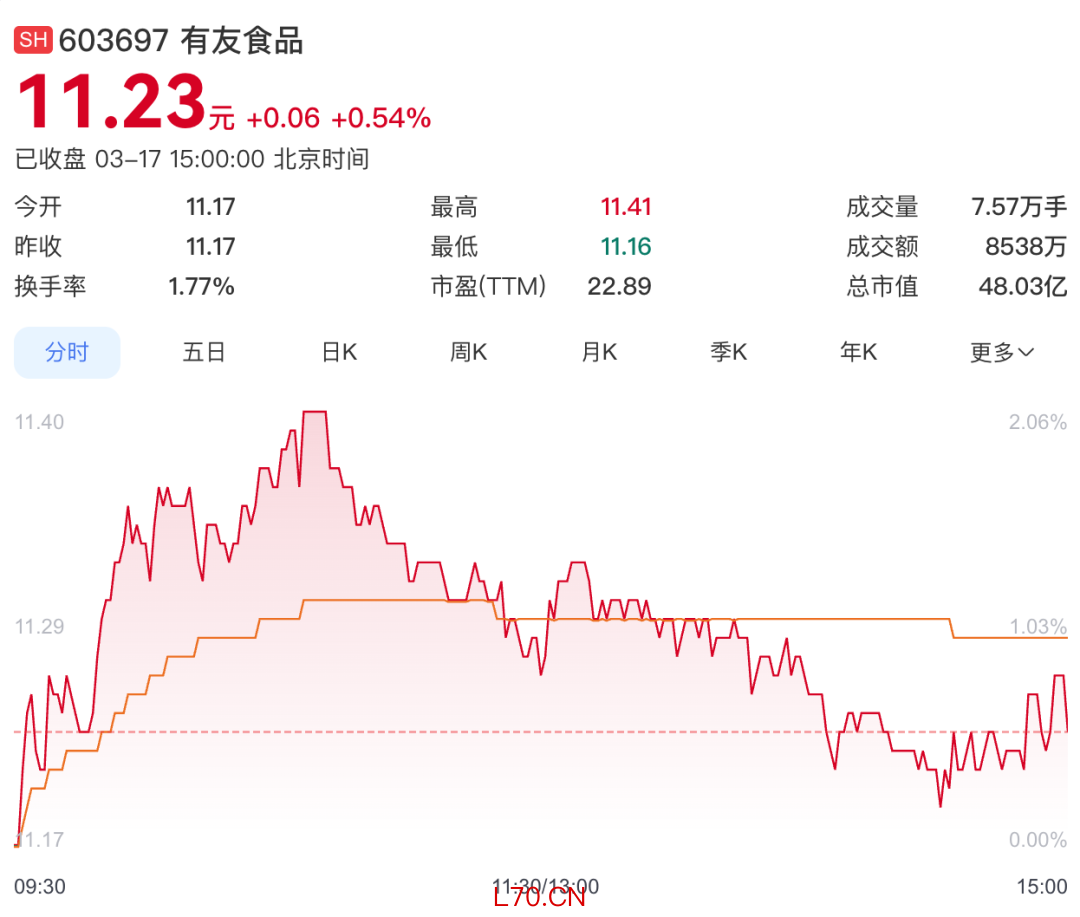 3月17日截至收盘,有友食品股价涨0.54%,报11.23元/股,总市值48.03亿元。