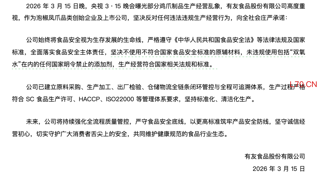 央视315晚会曝光漂白鸡爪后,“凤爪第一股”有友食品(603697.SH)再发声明。