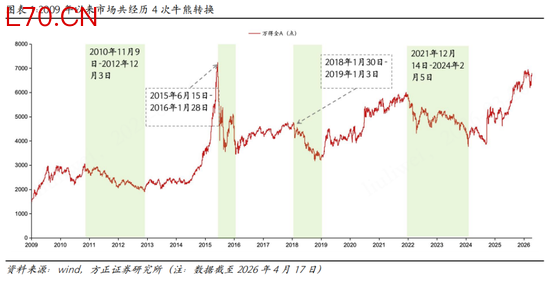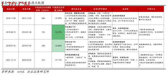 1、2009年以来,A股市场共发生过四次牛熊转换。过往的四轮牛熊转换分别发生在2010年11月、2015年6月、2018年1月和2021年12月,万得全A指数回撤幅度均达到30%以上。