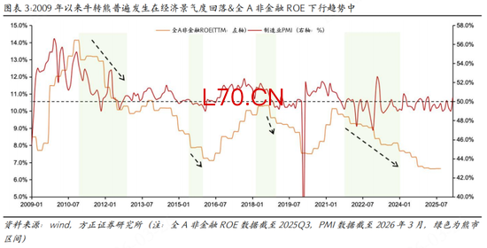 牛熊切换普遍发生在经济景气度回落&全A非金融ROE下行趋势中。2010年11月与2018年1月开始的牛转熊,尽管发生在经济景气度回落,但仍处于50枯荣线以上;2015年6月和2021年12月开始的牛转熊,发生在经济整体位于50枯荣线下方的回落、景气度持续回落的阶段。