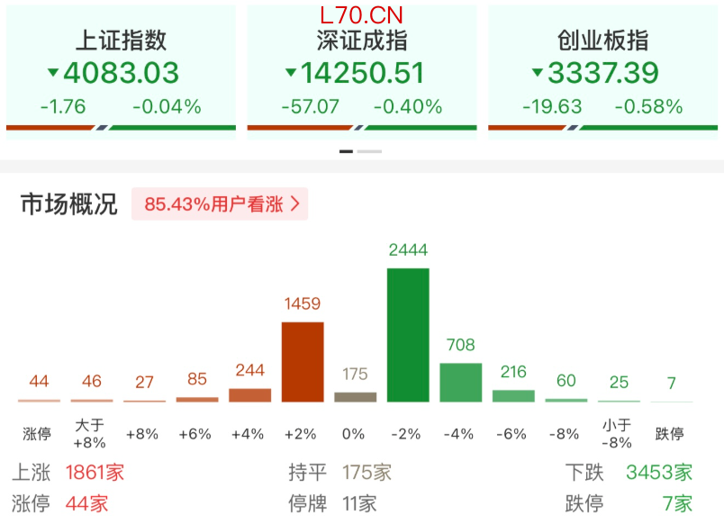 ]article_adlist-->今日早盘,A股市场冲高回落,三大指数均翻绿。沪深两市半日成交额1.37万亿,较上个交易日缩量1404亿。盘面上热点较为杂乱,全市场超3400只个股下跌。截至收盘,沪指跌0.04%,深成指跌0.4%,创业板指跌0.58%。