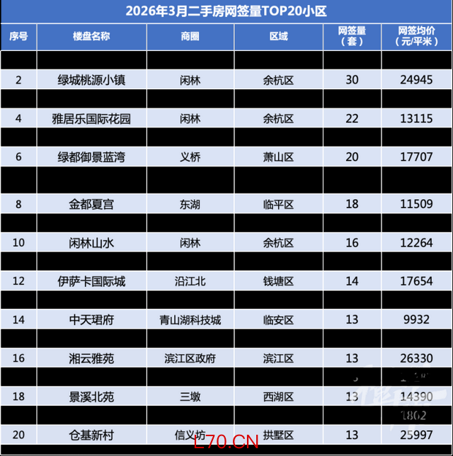 3月份成交量TOP20榜单,几乎成了刚需盘的集体秀场。临安的越秀星汇城以51套的绝对优势登上榜首,成交均价7770元/平方米;越秀悦映城、中天珺府均成交了13套,网签单价都未过万元/平方米。